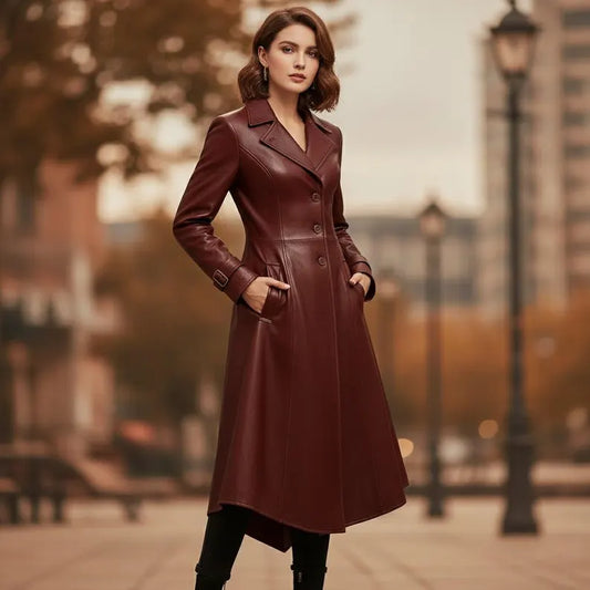 Womenâs Red Lambskin Double-Breasted Long Leather Trench Coat â Full-Length Tailored Winter Maxi Overcoat