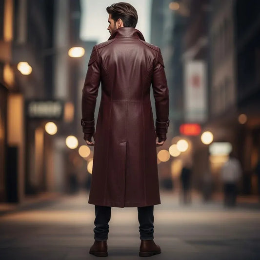 Menâs Maroon Genuine Sheep Leather Long Trench Coat â Quilted Shoulder Design Overcoat