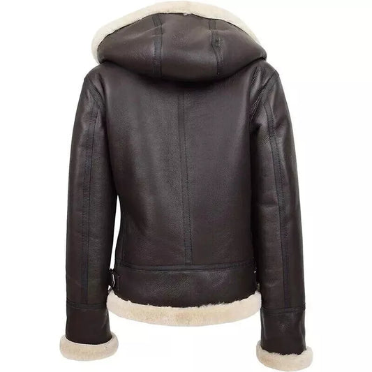 Women's Bomber Hooded B3 Aviator Flying Fur Shearling Real Leather Jacket Coat
