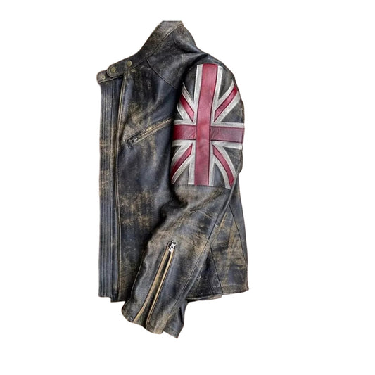 Biker Vintage Racer Union Jack Real Leather Distressed Jacket | unisex